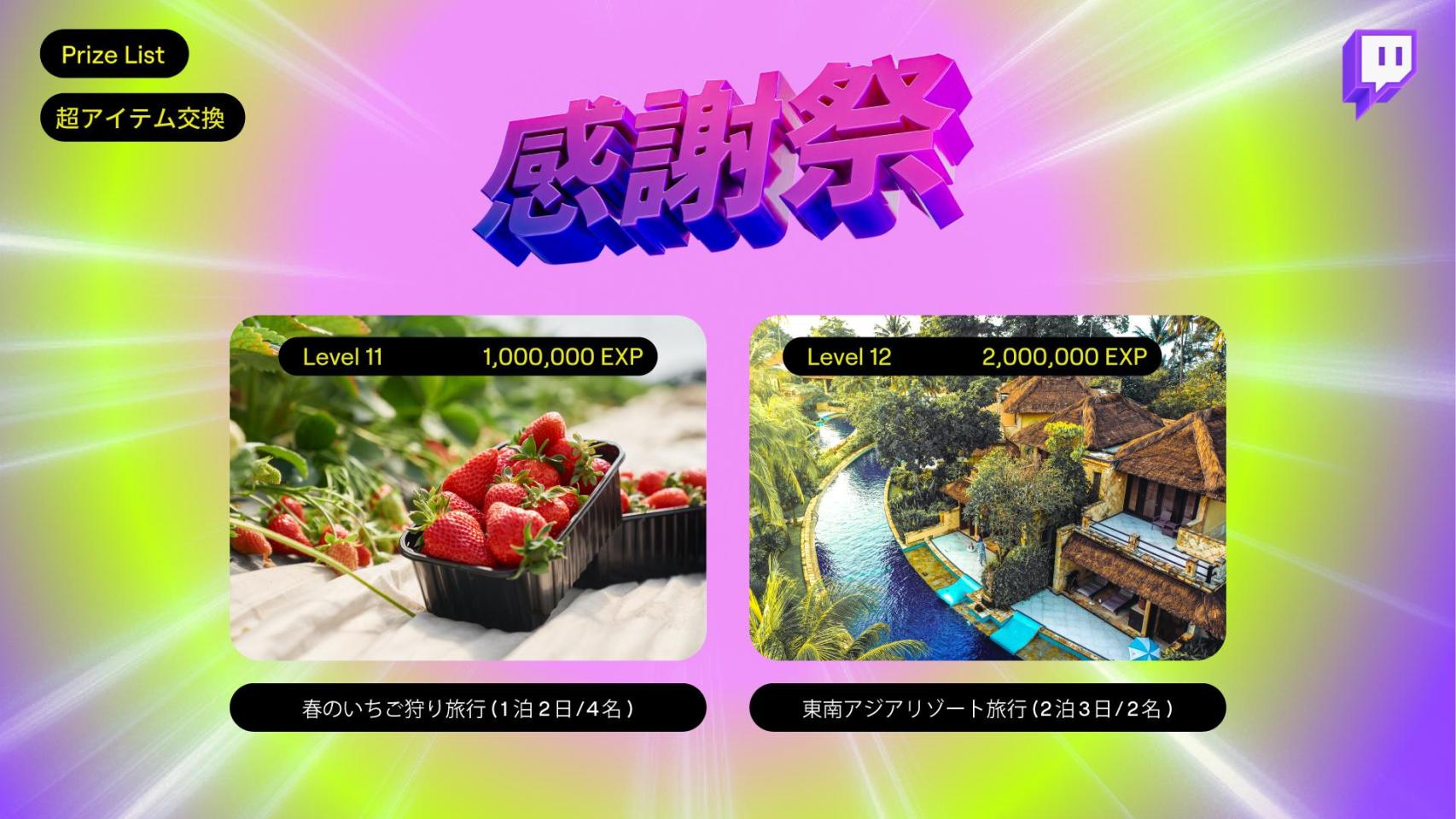 参加ストリーマーが獲得できる賞品は「感謝祭」「配信サポート&Twitch的体験」の2つのコンセプトで用意されており、獲得EXPと必要EXPが同じか、低い賞品をどれか一つ獲得することができます。アフィリエイトの参加者は最大LV5までの賞品が獲得できます。
